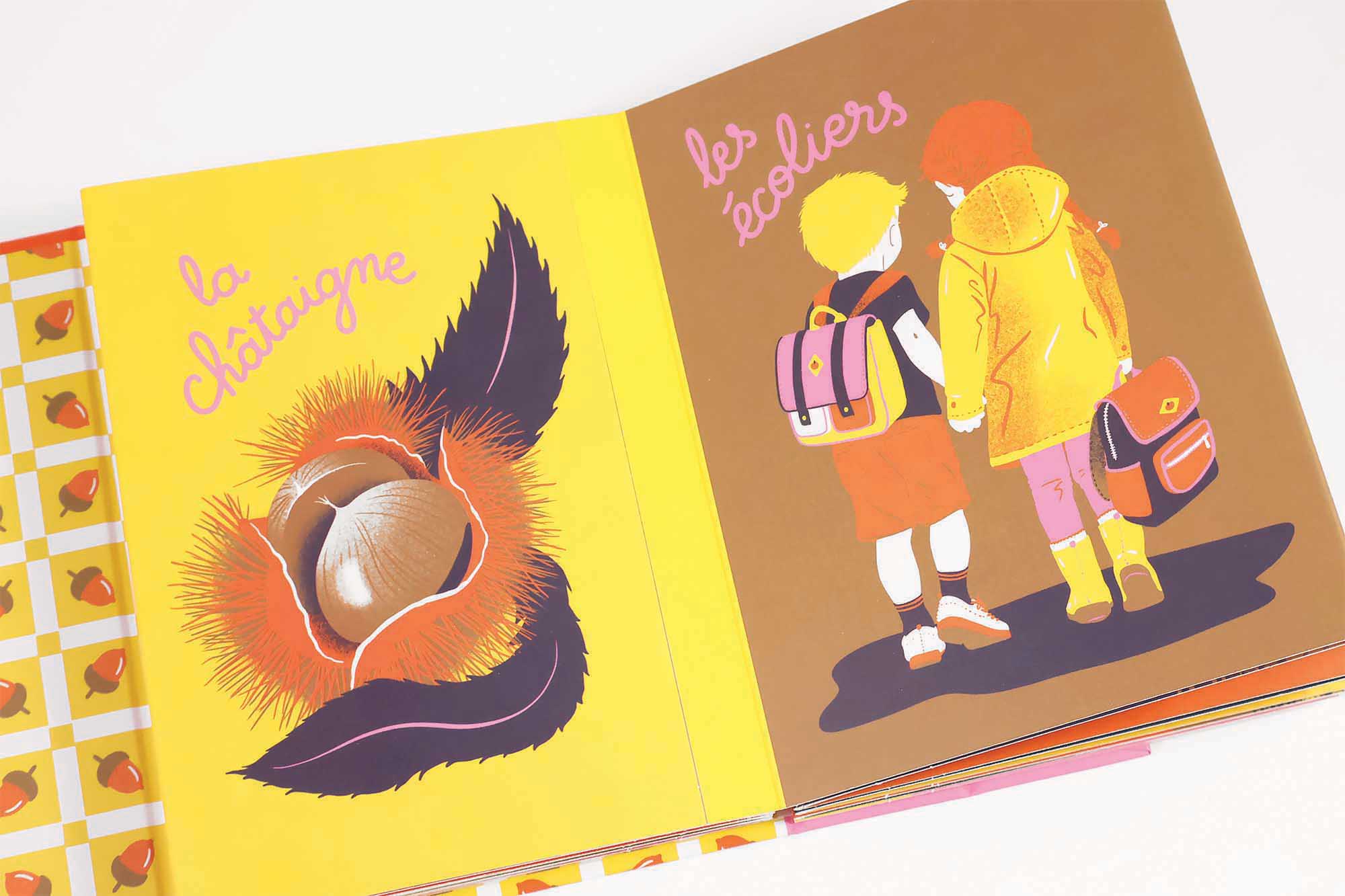 D’un côté de l’imagier, l’enfant se promène dans un paysage d’automne,